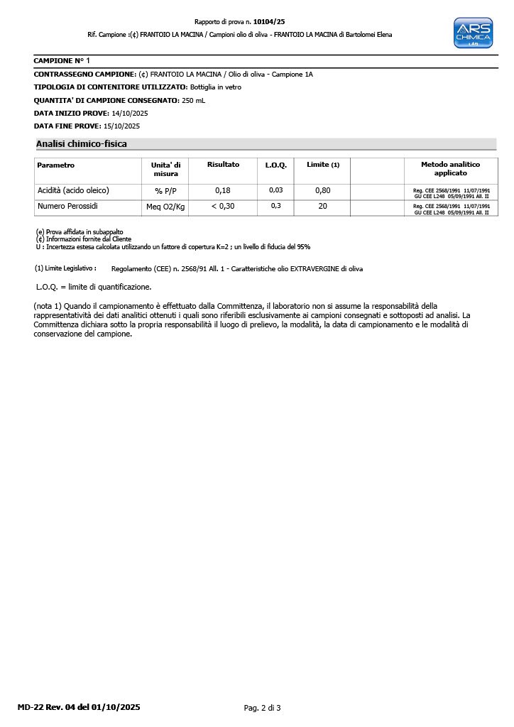 Analisi dell’Olio – Qualità certificataMyLike2025-10-21T16:17:28+02:00 Analisi dell'Olio - Qualità certificata Siamo talmente orgogliosi del nostro olio che abbiamo deciso di pubblicarne le sue analisi.La qualità eccezionale del nostro Olio Evo è certificata da una bassissima acidità e dalla presenza minima di perossidi.